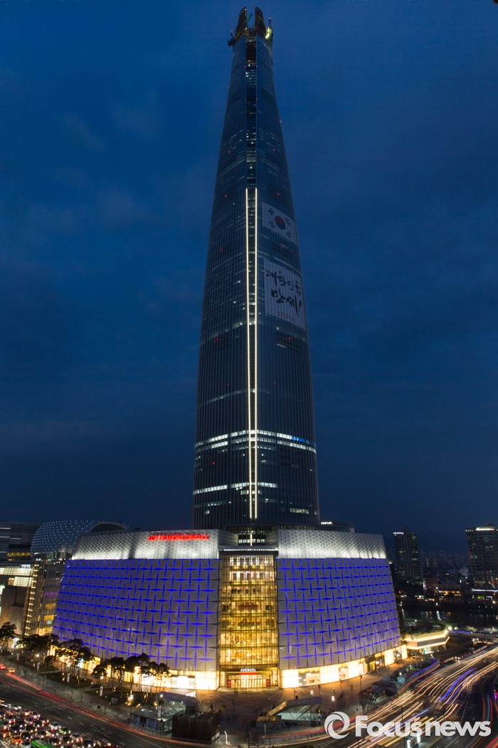 (서울=포커스뉴스) 세계 자폐인의 날인 2일 오후 서울 송파구 롯데월드타워의 건물 외벽에 파란색 LED 조명이 빛을 밝히고 있다.