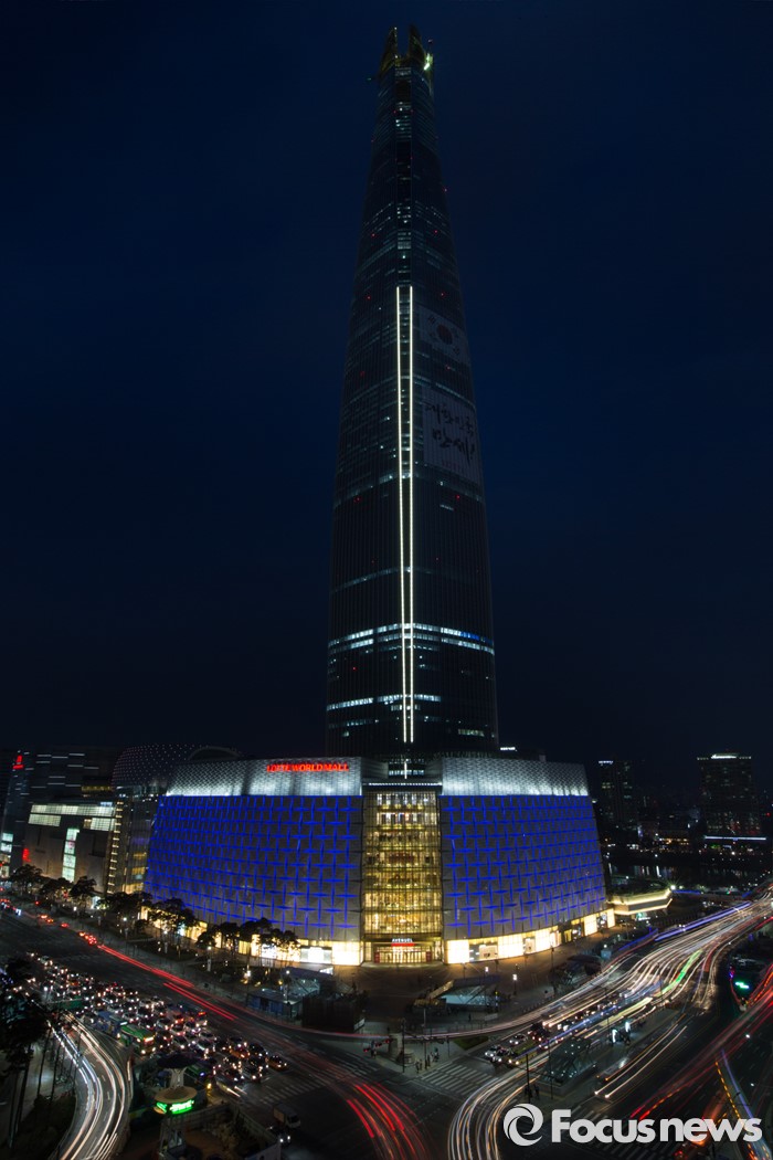 (서울=포커스뉴스) 세계 자폐인의 날인 2일 오후 서울 송파구 롯데월드타워의 건물 외벽에 파란색 LED 조명이 빛을 밝히고 있다.