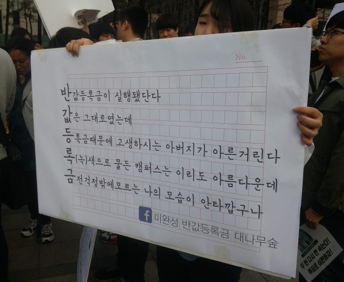 광운대학교 화학과에 재학중인 한모(23)씨는 "학점이 좋지 않으면 국가장학금을 신청할 수도 없고, 소득분위가 높은 학생은 혜택을 거의 보지 못한다"며 "고지서에 표시되는 금액 자체를 줄여야 진짜 반값등록금"이라고 설명했다.