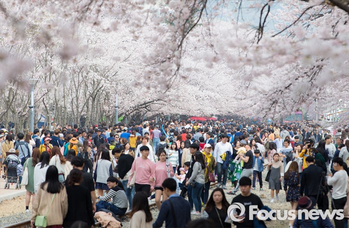 (창원=포커스뉴스) 2일 오후 경남 창원시 진해구 경화역을 찾은 관광객들이 만개한 벚꽃을 보며 즐거운 시간을 보내고 있다.