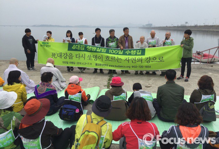 (목포=포커스뉴스) 불교환경연대소속 회원들이 3일 전남 목포시 영산강하구에서 사대강 생명살림 100일 순례길을 시작하면서 출정식을 갖고 있다.<사진=불교환경연대제공>