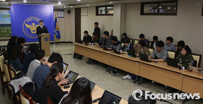 (서울=포커스뉴스) 4일 오전 서울 관악구 관악경찰서에서 신원미상의 민원인 여성이 경찰관 4명에게 염산으로 추정되는 액체를 뿌리는 사건이 발생한 가운데 관악경찰서 김차복 경위가 사건 브리핑을 하고 있다.