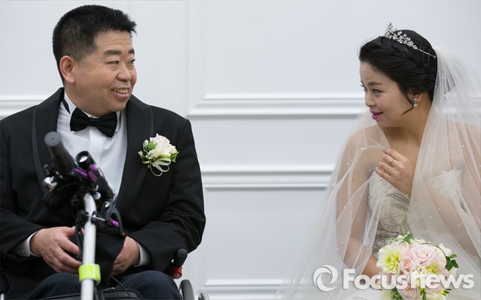 (대전=포커스뉴스) 4일 오전 대전 유성구 호텔ICC에서 열린 제18회 대전장애인자활실천대회 및 합동결혼식에서 신랑과 신부가 밝은 모습을 보이고 있다.