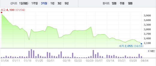 1월 초 주가였던 4000원과 비교한다면 무려 48.25% 하락했다. 사실상 연초 주가에서 반토막 난 셈이다.