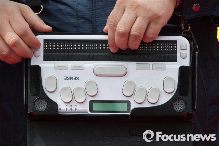 | △ 점자정보단말기 이용해 발언하는 시각장애인 |
