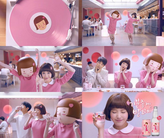 '기분 좋게 발그레'라는 카피 아래 단발머리에 핑크색 원피스를 입은 아이유가 상큼한 미소와 귀여운 댄스로 '이슬톡톡'의 특징을 재미있게 표현하는 모습을 담았다.