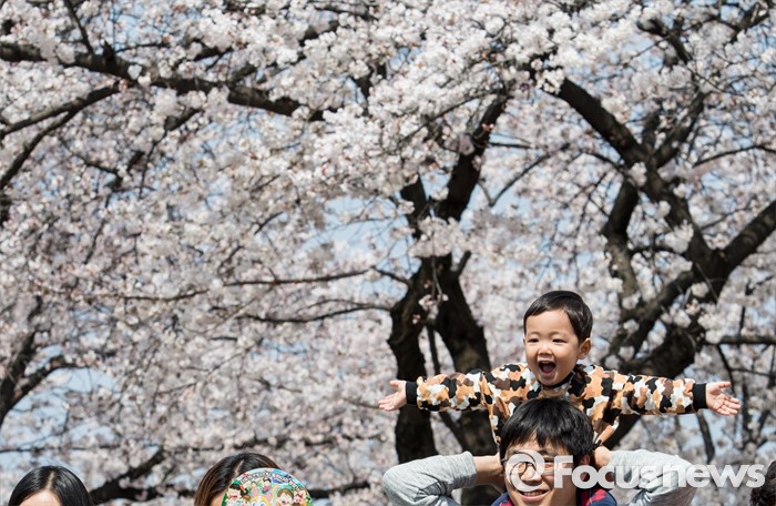 (서울=포커스뉴스) 7일 오전 서울 여의도 윤중로 일대에서 열린 벚꽃축제를 찾은 어린이가 아빠 어깨 위에서 활짝 웃고 있다.