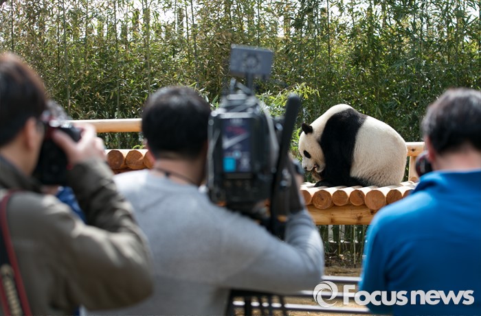 (용인=포커스뉴스) 에버랜드가 오는 21일 일반관람객에게 공개를 앞두고 판다월드에서 생활 중인 시진핑 중국 국가주석의 선물 '아이바오(愛寶)'와 '러바오(樂寶)' 판다커플을 7일 언론에 공개했다. 사진은 수컷 판다 러바오의 모습.