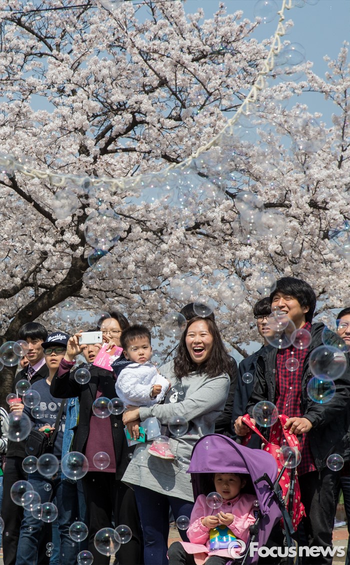 (서울=포커스뉴스) 7일 오전 서울 여의도 윤중로 일대에서 열린 벚꽃축제를 찾은 시민들이 만개한 벚꽃과 비눗방울 쇼를 함께 즐기고 있다.