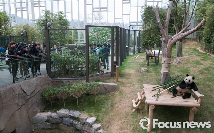 (용인=포커스뉴스) 에버랜드가 오는 21일 일반관람객에게 공개를 앞두고 판다월드에서 생활 중인 시진핑 중국 국가주석의 선물 '아이바오(愛寶)'와 '러바오(樂寶)' 판다커플을 7일 언론에 공개했다. 사진은 암컷 판다 아이바오의 모습.