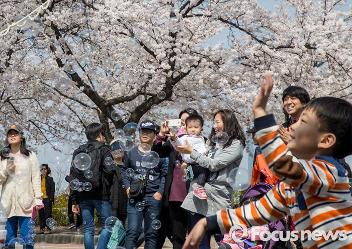 (서울=포커스뉴스) 7일 오전 서울 여의도 윤중로 일대에서 열린 벚꽃축제를 찾은 시민들이 만개한 벚꽃과 비눗방울 쇼를 함께 즐기고 있다.