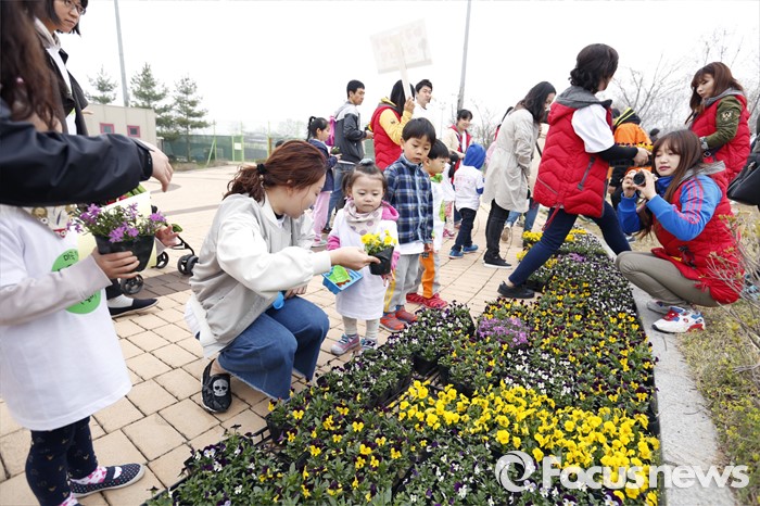 (서울=포커스뉴스) 9일 경기도 양주시 장흥문화예술회관에서 열린 '대한아토피협회와 함께하는 꽃나무 심는 날'에 참가한 어린이들이 꽃나무를 심고 있다. 이번 행사는 경기도 양주시 시설관리공단의 협조와 대유위니아, CJ제일제당, 에이치에스디, 에이플트리, 드올앤컴퍼니 등 기업들의 후원으로 진행됐으며, 정슬기의 마술쇼, 쿠키토이 티나(김민희 아나운서)의 재능기부도 이어졌다. <사진제공=대한아토피협회>