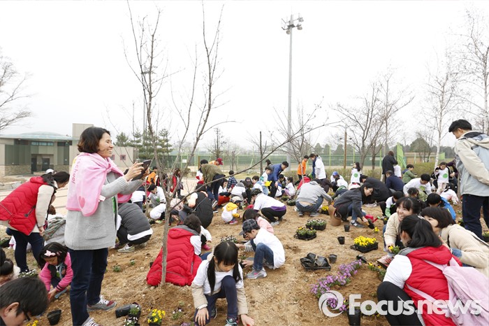 (서울=포커스뉴스) 9일 경기도 양주시 장흥문화예술회관에서 열린 '대한아토피협회와 함께하는 꽃나무 심는 날'에 참가한 어린이들이 꽃나무를 심고 있다. 이번 행사는 경기도 양주시 시설관리공단의 협조와 대유위니아, CJ제일제당, 에이치에스디, 에이플트리, 드올앤컴퍼니 등 기업들의 후원으로 진행됐으며, 정슬기의 마술쇼, 쿠키토이 티나(김민희 아나운서)의 재능기부도 이어졌다. <사진제공=대한아토피협회>