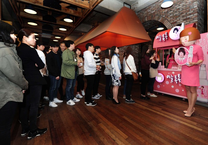 그 첫 번째 이벤트가 열린 지난 주말, 서울 강남역 카페 알베르에는 '이슬톡톡'을 맛 보기 위해 소비자들이 줄지어 서는 진풍경이 연출됐다. SNS(사회관계망서비스) 등을 통해 '이슬톡톡'을 접했던 소비자들이 직접 그 맛을 보기 위해 긴 기다림도 마다하지 않는 것이다.