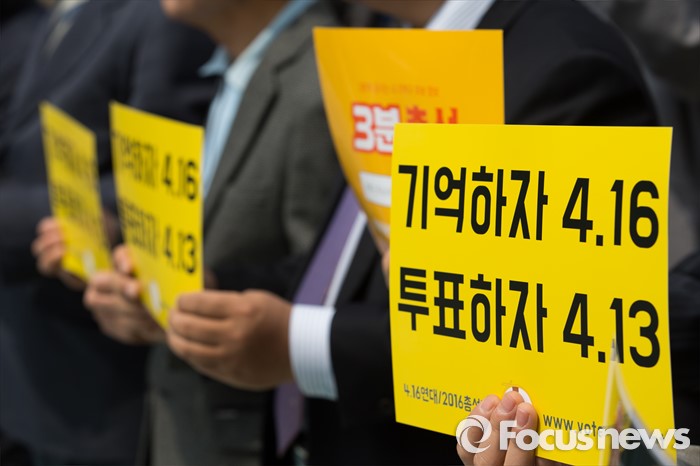 (서울=포커스뉴스) 제20대 국회의원 선거를 하루 앞둔 12일 오전 서울 광화문광장에서 2016 총선시민네트워크 회원들이 총선 투표참여를 호소하는 손팻말을 들고 있다.