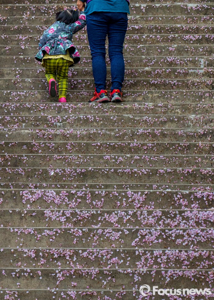 (부산=포커스뉴스) 부산 사상구의 한 아파트에서 할머니 손을 잡은 어린이가 꽃잎이 떨어져있는 계단을 아장아장 걸어가고 있다.