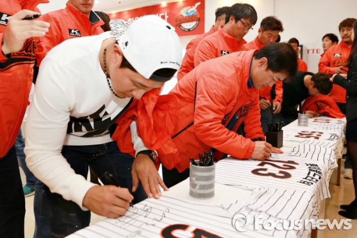 롯데월드타워는 지난 달 17일 최상층부 다이아그리드 구조의 랜턴(Lantern) 공사를 완료하고, 올해 말 완공을 앞두고 있다. 롯데자이언츠는 이날부터 3일 동안 잠실에서 LG 트윈스와 3연전을 한다.11일 롯데월드타워 홍보관을 찾은 롯데자이언츠 선수단이 준비된 유니폼에 싸인을 하고 있다. 이들이 싸인한 유니폼은 롯데월드타워 완공 후 홍보관에서 전시할 예정이다.<사진제공=롯데물산>