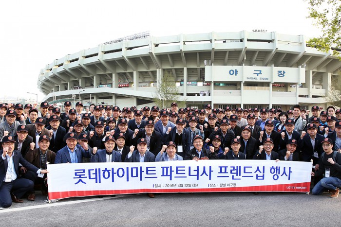 연말마다 파트너사들과 독거노인을 위한 김장 담그기 봉사활동을 펼치고 있다. 올 설에는 명절을 앞둔 파트너사들에게 상품대금을 현금으로 선지급했다.롯데하이마트와 파트너사 임직원들이 잠실야구장에서 프로야구 경기를 관람한 후 기념촬영하고 있다.<사진제공=롯데하이마트>