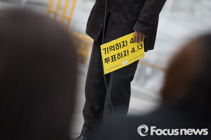 (서울=포커스뉴스) 제20대 국회의원선거날인 13일 오후 서울 종로구 광화문 광장에서 열린 세월호 2주기 추모행사 세월호 낭독회에서 사회자가 발언을 하고 있다.