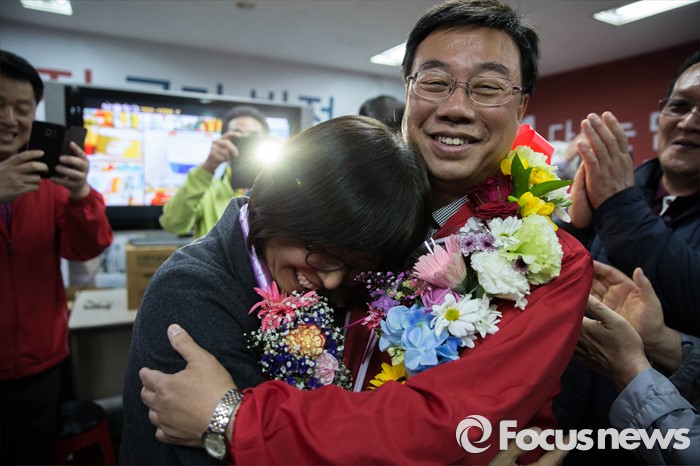 (성남=포커스뉴스) 제20대 국회의원 선거날인 13일 오후 경기도 성남 중원구에 위치한 선거사무실에서 신상진 새누리당 후보가 '당선확실' 이라는 방송사 개표 상황을 확인하고 부인 김미숙씨와 포옹하고 있다.