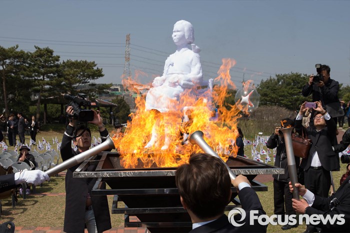 (화성=포커스뉴스) 15일 오전 경기도 화성시 제암리 3.1운동 순국 기념관에서 열린 '4.15 제암, 고주리 학살사건 희생자 추모제'에서 평화의 봉화가 타오르고 있다.
