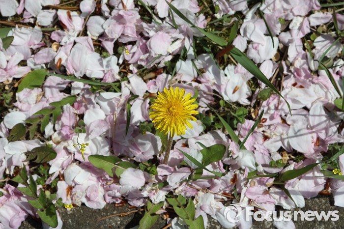 (서울=포커스뉴스) 15일 경기 용인시 명지대학교 자연캠퍼스 화단에 샇은 벚꽃잎들 사이로 민들레가 노랗게 피어 있다. <사진제공=명지대학교>