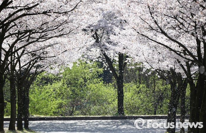 (서울=포커스뉴스) 15일 경기 용인시 명지대학교 자연캠퍼스에서 벚꽃잎이 바람에 흩날리고 있다. <사진제공=명지대학교>