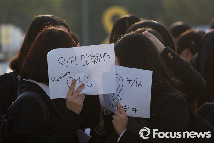 (안산=포커스뉴스) 세월호 참사 2주기를 하루 앞둔 15일 오후 경기도 안산시 단원구 세월호 정부합동분향소에서 안산시 고교학생회장단연합회 학생들이 추모제 행진을 위해 준비를 하고 있다.