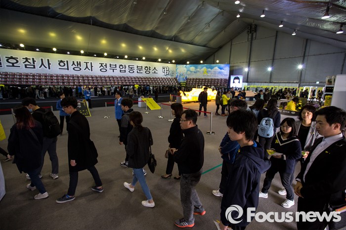 (안산=포커스뉴스) 세월호 참사 2주기인 16일 오전 경기도 안산시 단원구 화랑유원지에 마련된 합동분향소에 추모객 발길이 이어지고 있다.