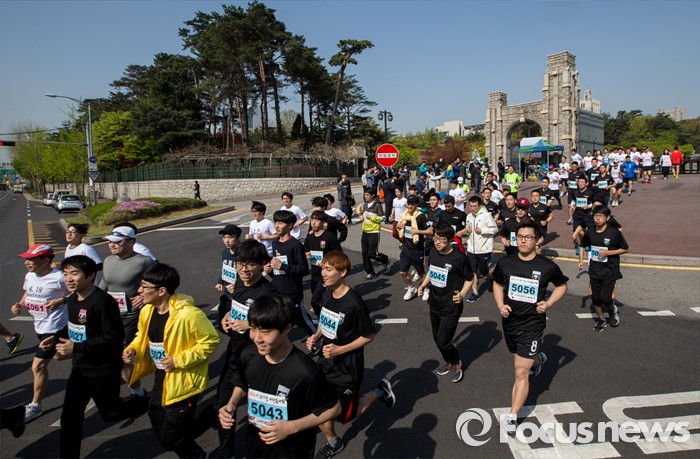 (서울=포커스뉴스) 4·19 혁명 56주기를 하루 앞둔 18일 오전 서울 성북구 고려대학교에서 열린 '4·18 희망나눔 마라톤'에 참가한 고려대생 및 일반인 참가자들이 힘차게 출발하고 있다.