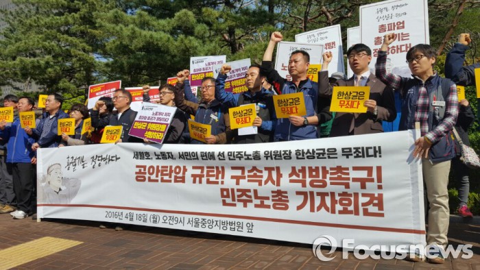(서울=포커스뉴스) 공안탄압 규탄과 구속자 석방을 촉구하는 기자회견이 민주노총 주최로 18일 오전 9시 서울 서초구 서울중앙지방법원 앞에서 열렸다.