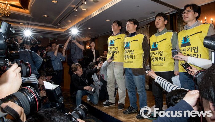 (서울=포커스뉴스) 18일 오전 서울 중구 롯데호텔앤리조크 서울에서 열린 가습기 살균제 사망사건 관련 기자회견이 끝나고 피해자 유족들을 비롯한 시민단체 회원들이 입장을 발표하고 있다.
