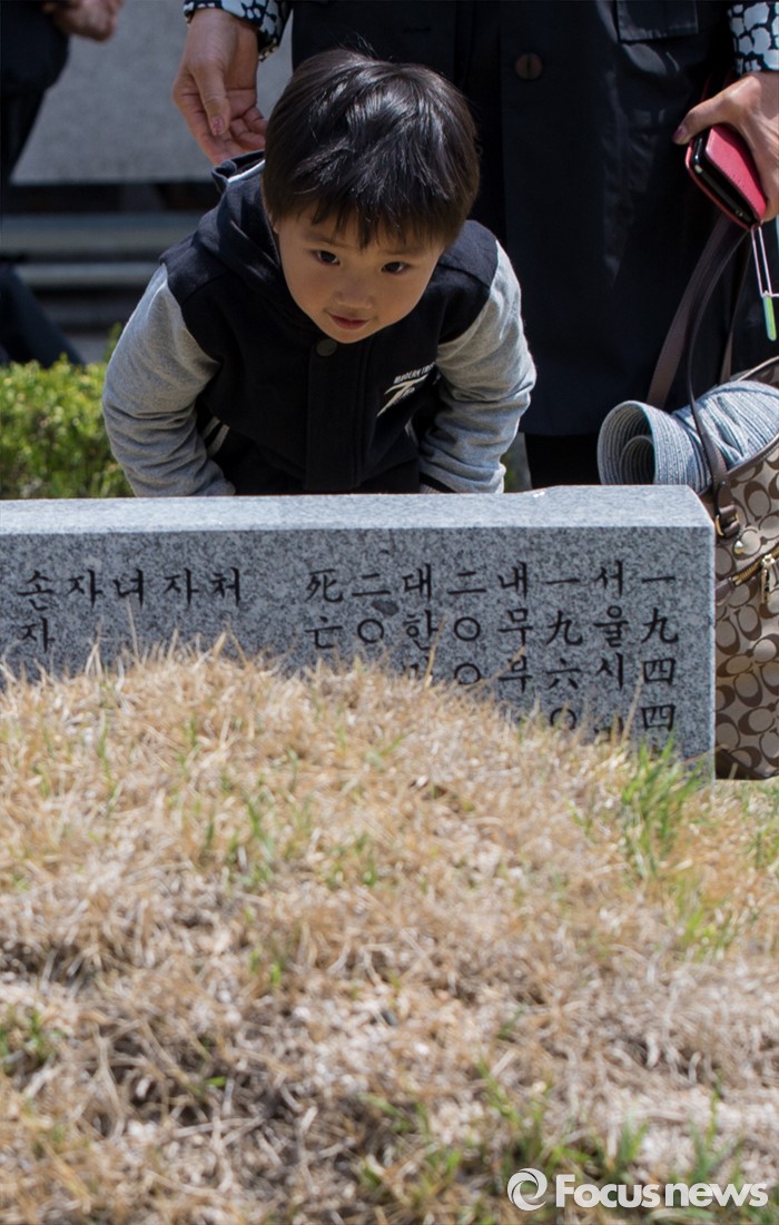 (서울=포커스뉴스) 4·19 혁명 56주기를 하루 앞둔 18일 오전 서울 강북구 국립4.19 민주묘지에서 희생자의 손자들이 묘비에 인사하고 있다.