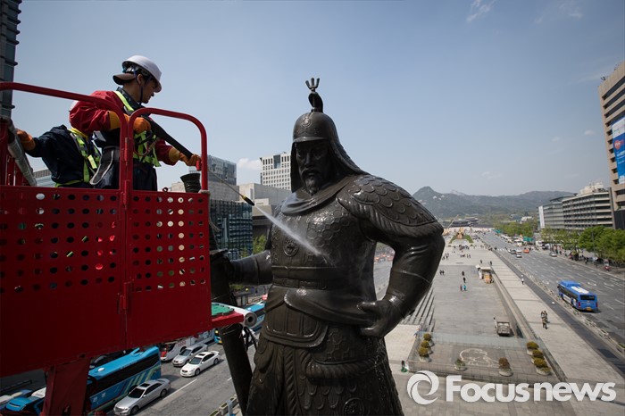 (서울=포커스뉴스) 18일 오전 서울 세종로사거리 광화문광장에서 서울시 관계자들이 이순신장군 동상 세척 및 보존 작업을 하고 있다.