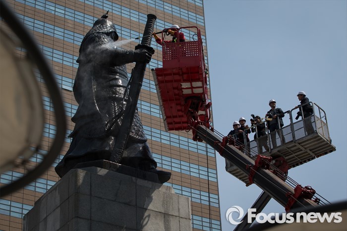 (서울=포커스뉴스) 18일 오전 서울 세종로사거리 광화문광장에서 서울시 관계자들이 이순신장군 동상 세척 및 보존 작업을 하고 있다.