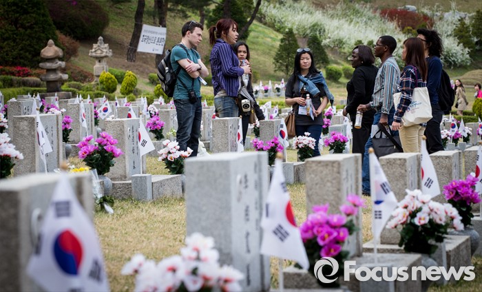 (서울=포커스뉴스) 4·19 혁명 56주기를 하루 앞둔 18일 오후 서울 강북구 국립4.19 민주묘지에서 한신대학교 신학과 외국인 학생들이 희생자 묘소를 참배하고 있다.