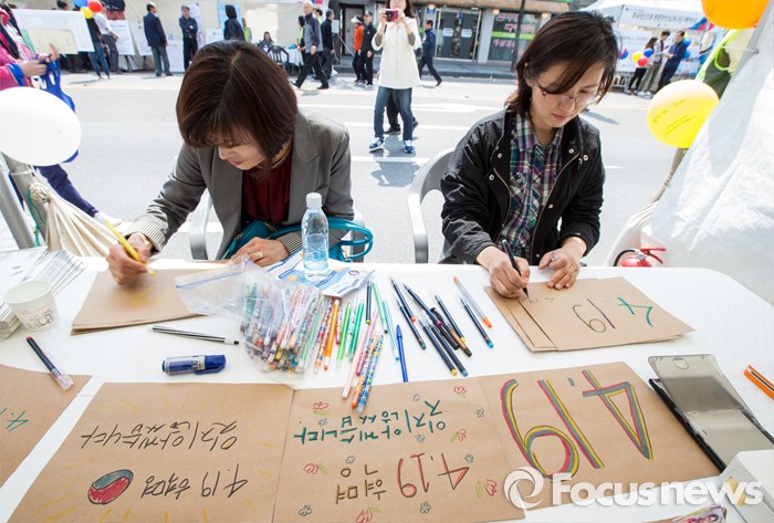 (서울=포커스뉴스) 4·19 혁명 56주기를 하루 앞둔 18일 오후 서울 강북구 광산사거리 인근에서 열린 '4.19 혁명 국민문화제 2016'에 참석한 시민들이 4.19 기억 팻말을 만들고 있다.