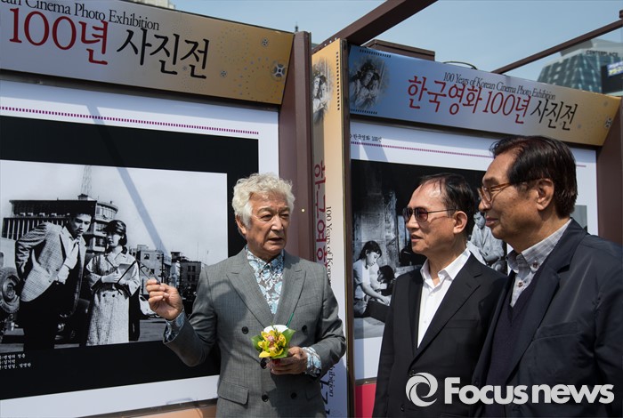 (서울=포커스뉴스) 18일 오후 서울시청 앞 광장에서 열린 '한국영화 100년 사진전' 개막식에서 배우 신성일이 전시된 작품을 설명하고 있다.