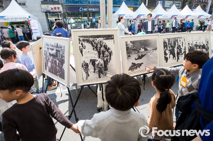 (서울=포커스뉴스) 4·19 혁명 56주기를 하루 앞둔 18일 오후 서울 강북구 광산사거리 인근에서 열린 '4.19 혁명 국민문화제 2016'에 참석한 어린이들이 혁명 당시 사진 자료들을 보고 있다.