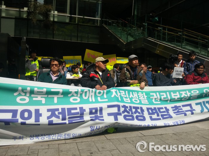 (서울=포커스뉴스)서울장애인자립생활센터협의회, 서울장애인차별철폐연대 등 단체가 연합한 성북장애인권네트워크는 18일 오후 서울 성북구청 앞에서 기자회견을 열고 김영배(49) 성북구청장에 대해 성북지역 거주 장애인 자립 생활 보장을 촉구하는 기자회견을 열었다.