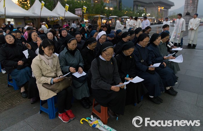 (서울=포커스튜스) 세월호 참사 2주기가 이틀 지난 18일 오후 서울 종로구 광화문광장에서 신부들과 시민들이 '세월호 희생자 기억미사'에 참석하고 있다.