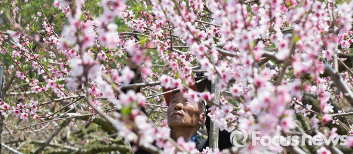 (세종=포커스뉴스) 화창한 봄 날씨를 보인 19일 오전 세종시 연서면 복숭아밭에서 농민이 복사꽃을 속아내고 있다.