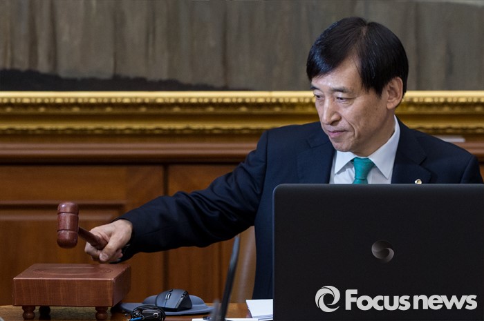 내년에는 저유가로 인한 물가하방 압력 약화와 경기의 점진적 개선에 힘입어 2.0%로 높아질 것으로 전망됐다.(서울=포커스뉴스) 이주열 한국은행 총재가 19일 오전 서울 중구 남대문로 한국은행 본관에서 열린 금융통화위원회의에 참석해 개회를 알리는 의사봉을 두드리고 있다. 2016.04.19 양지웅 기자