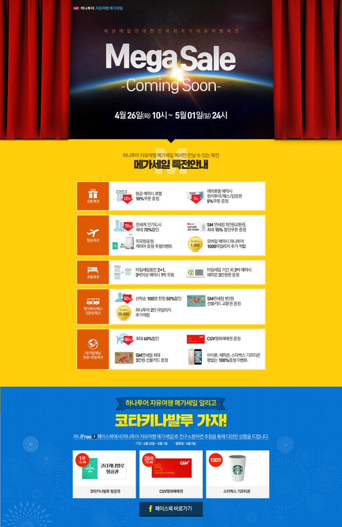 하나투어 자유여행 메가세일은 오는 26일 오전 10시 정식 오픈 예정이다. 22일부터는 하나프리 페이스북의 '친구 소환' 이벤트를 통해 코타키나발루 항공권, 영화예매권, 커피 기프티콘 등이 쏟아지는 푸짐한 경품행사가 진행될 예정이다.하나투어는 오는 26일부터 6일간 '하나투어 자유여행 메가세일'을 진행한다.<사진제공=하나투어>