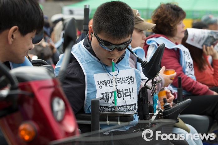 (서울=포커스뉴스) 20일 오후 서울 광화문 광장에서 420장애인차별철폐연대 공동투쟁단 단원들이 '420장애인차별철폐 투쟁결의대회'를 하고 있다.