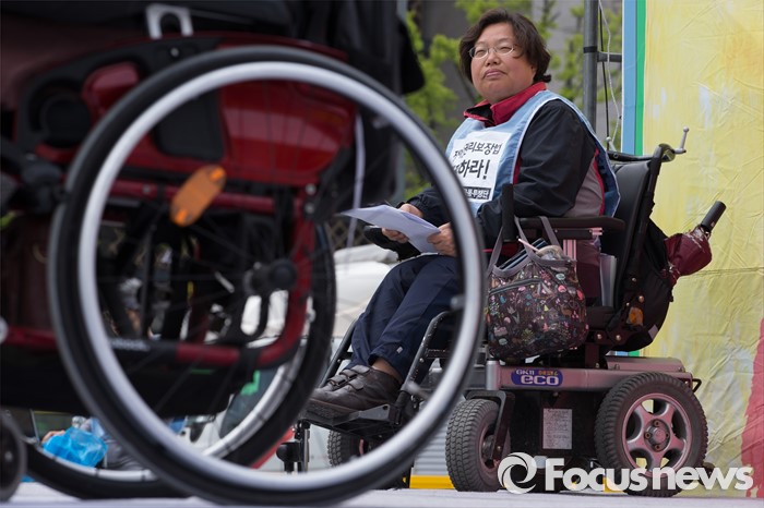 (서울=포커스뉴스) 20일 오후 서울 광화문 광장에서 420장애인차별철폐연대 공동투쟁단 단원들이 '420장애인차별철폐 투쟁결의대회'를 하고 있다.