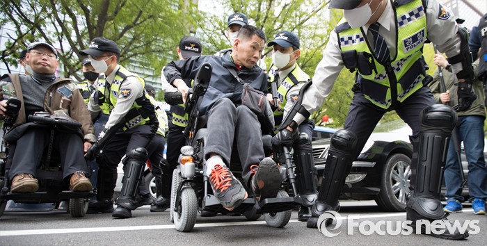 (서울=포커스뉴스) 20일 오후 서울 광화문 광장에서 '420장애인차별철폐 투쟁결의대회'를 마친 일부 참가자들이 행진을 하던중 예정된 진로를 벗어나자 경찰과 대치를 하고 있다.