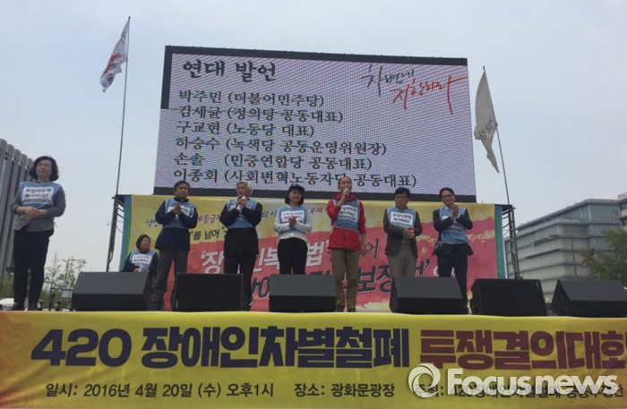 420 공투단은 이날 결의대회를 마치고 광화문 광장을 시작으로 행진을 진행하며 오후 6시에는 다시 광화문 광장으로 돌아와 제14회 서울장애인인권영화제 개막식을 연다.20일 서울 광화문 광장에서 열린 420장애인차별철폐 투쟁결의대회에서 정계 인사들이 연대발언을 하고 있다. 박지선 기자