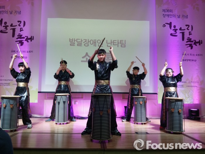 김상현(37) 종로장애인복지관 사회복지사는 "비장애인들이 휠체어 장애인이나 시각장애인들이 겪는 불편함을 이해하는 시간이 됐을 것"이라면서 "경사로나 점자 메뉴판, 도움 벨 등 장애인 배려 시설이 더 많이 늘어야 장애인들의 보행권이 향상될 것"이라고 설명했다.20일 서울 종로구 종로장애인복지관에서 열린 '어울누림 축제' 1부 사전공연 순서에서 난타 공연을 하고 있는 발달장애인 난타팀 소.통(소리로 통하다). 장지훈 기자 jangpro@focus.co.kr