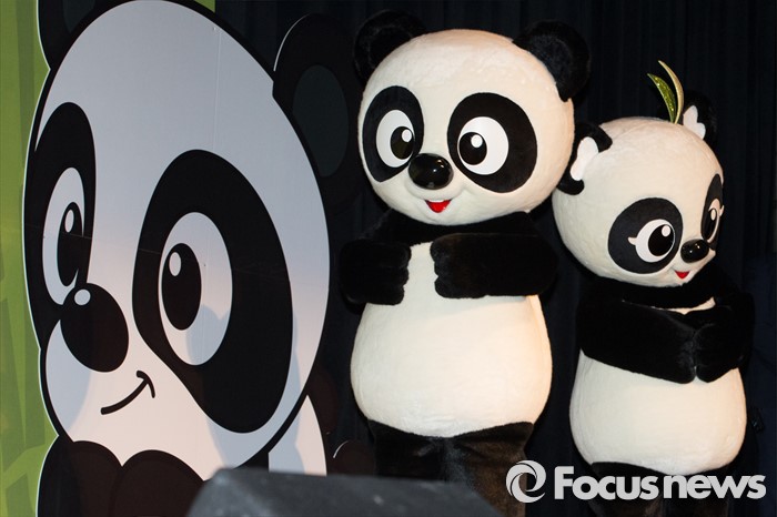 (용인=포커스뉴스) 21일 오전 경기도 용인시 에버랜드에서 열린 '판다월드 개관식'에서 러바오와 아이바오 팬더 캐릭터 인형들이 무대로 향하고 있다.